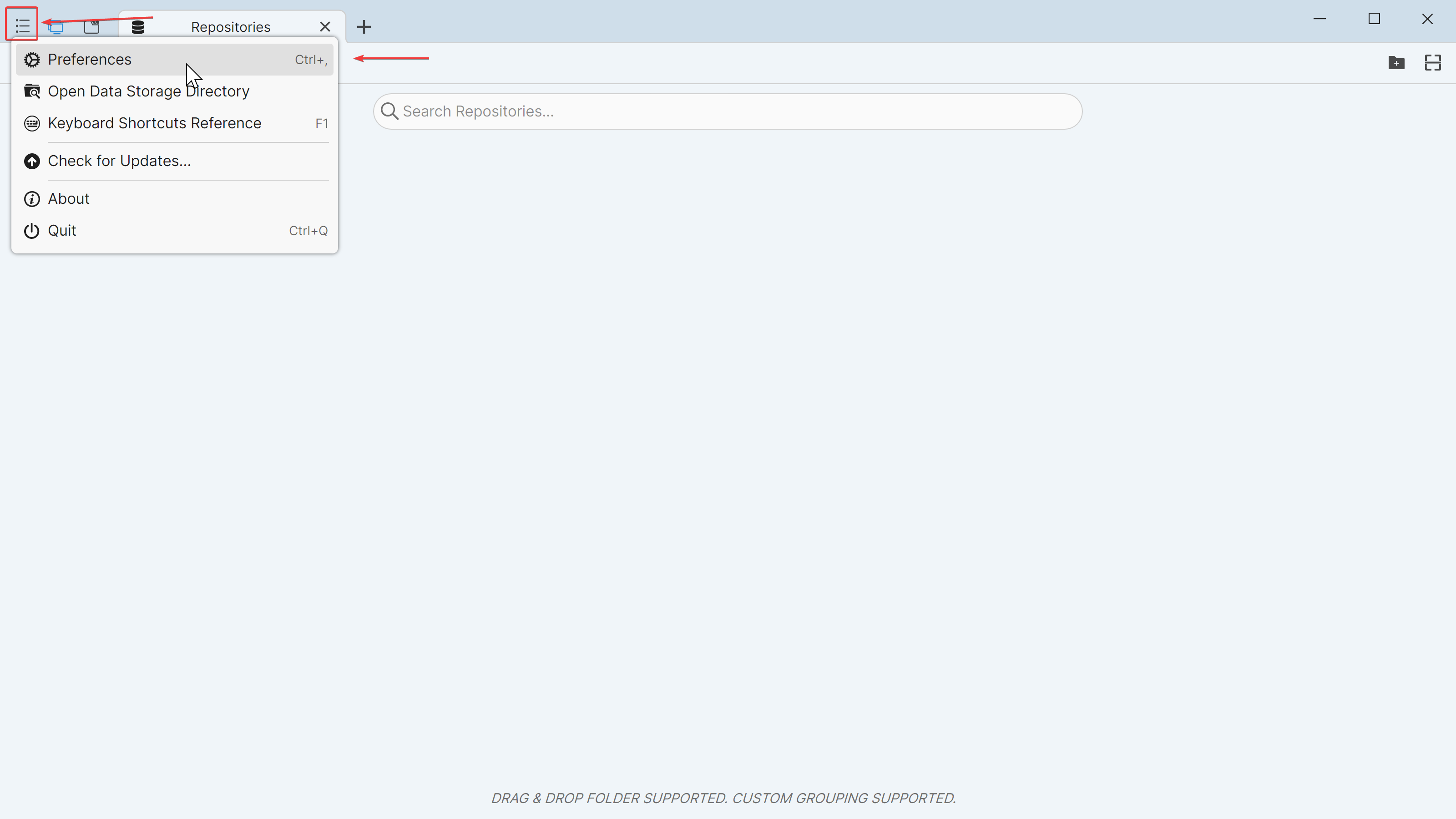 - There's one final thing we need to configure, and that is the username and email that Git will use. Click the three bars in the top right, and then click "Preferences".