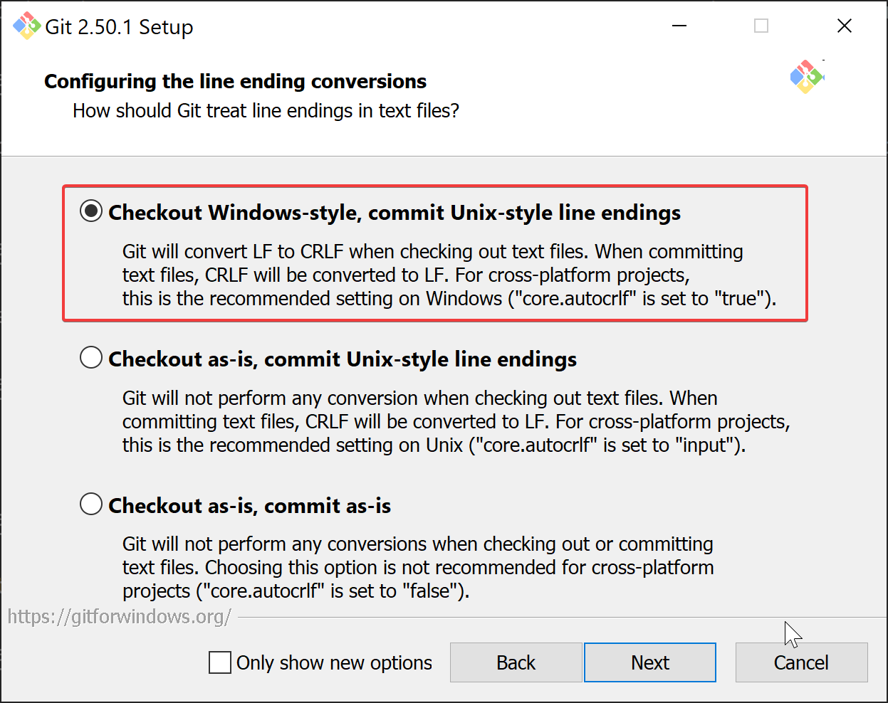 - Select "Checkout Windows-style, commit Unix-style line endings".