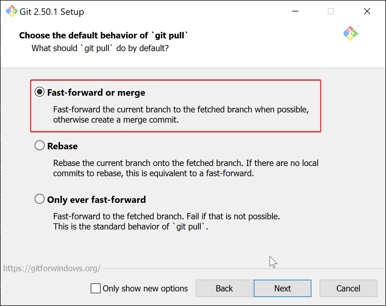 - This one is important. Select "fast-forward or merge".