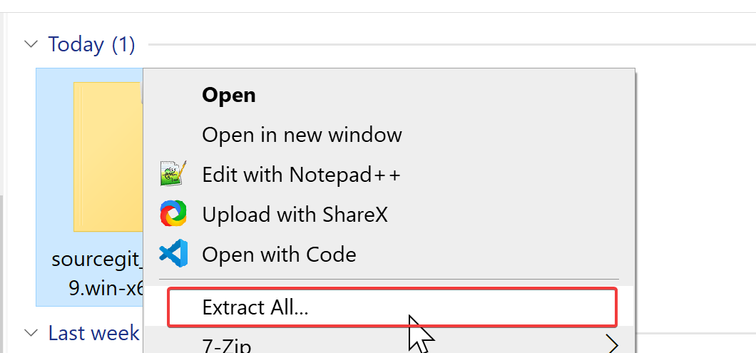 - Open your Downloads folder (or wherever you downloaded this file) in File Explorer. Right click the file and select "Extract all."
