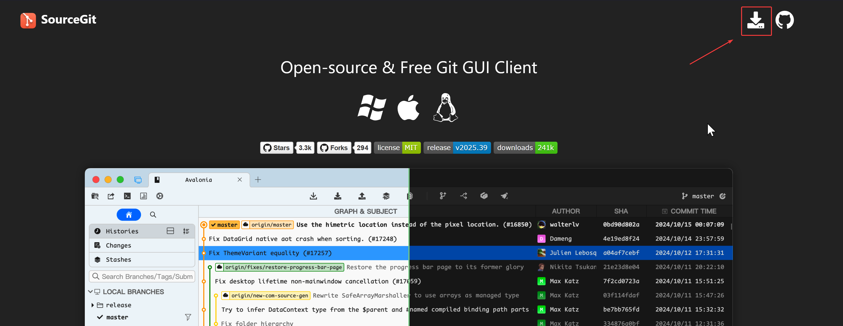 - Go to SourceGit's website and click the download button in the top right.