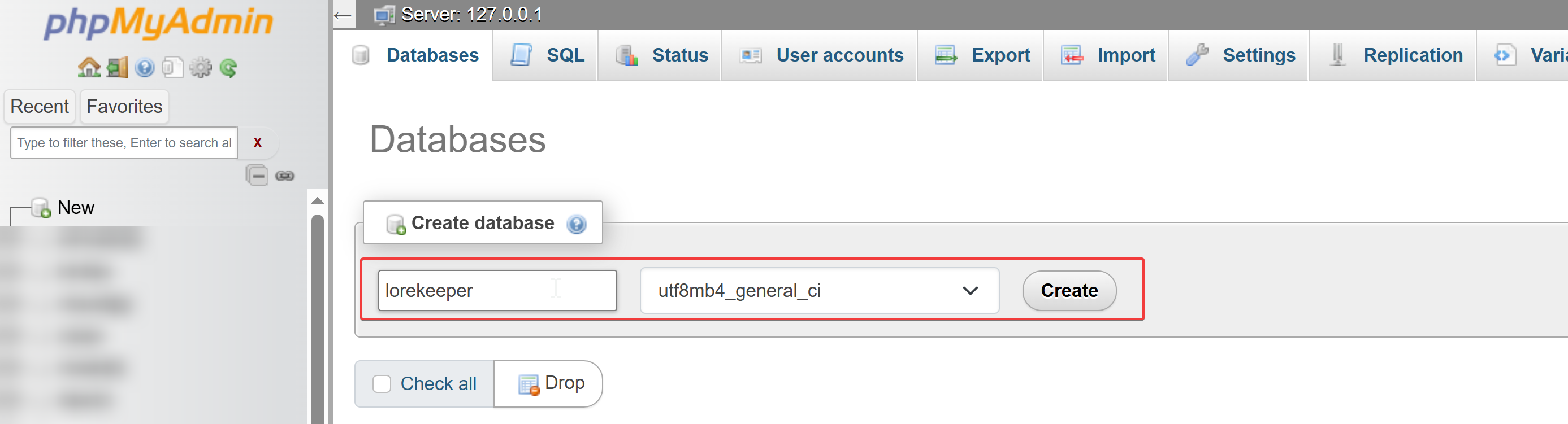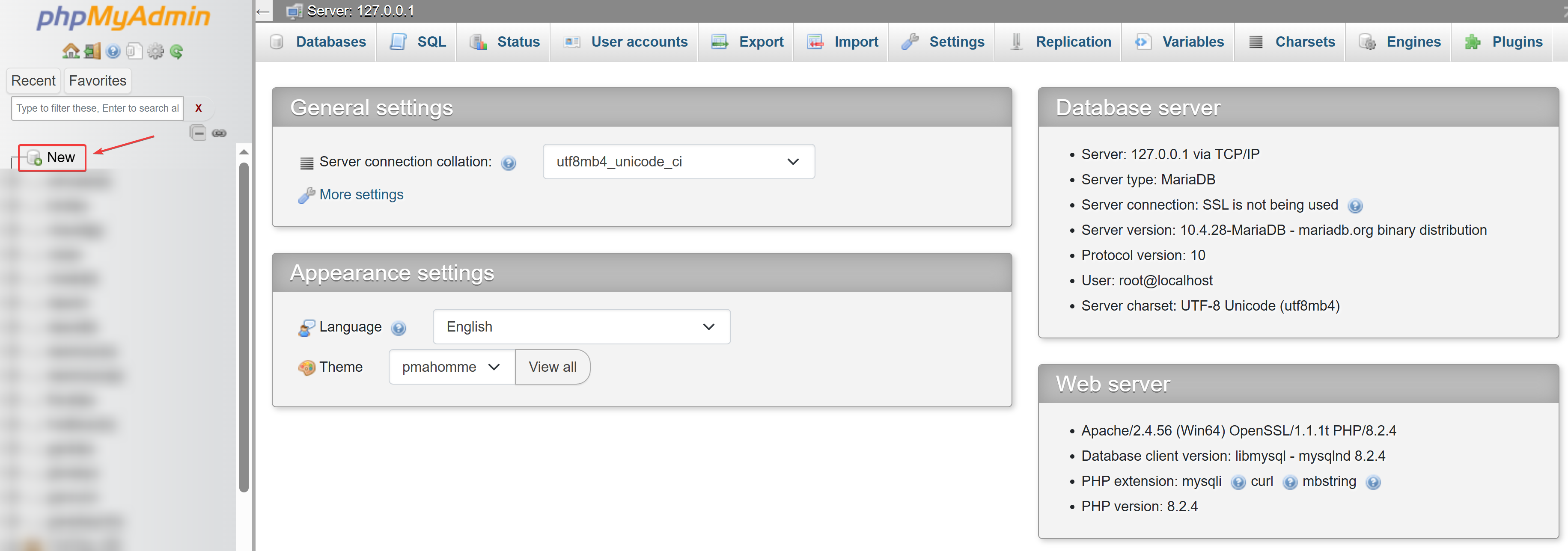 - This will open a window similar to this in your browser. This is PHPMyAdmin, and it is where we control how most of the data is stored for Lorekeeper. Click "New".