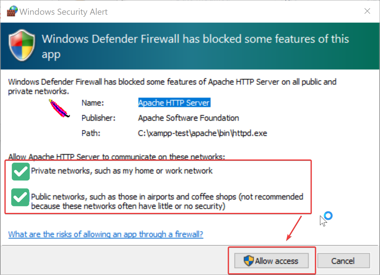 If you are presented with a window like this for either application: Check both "Private" and "Public", then click "Allow Access".