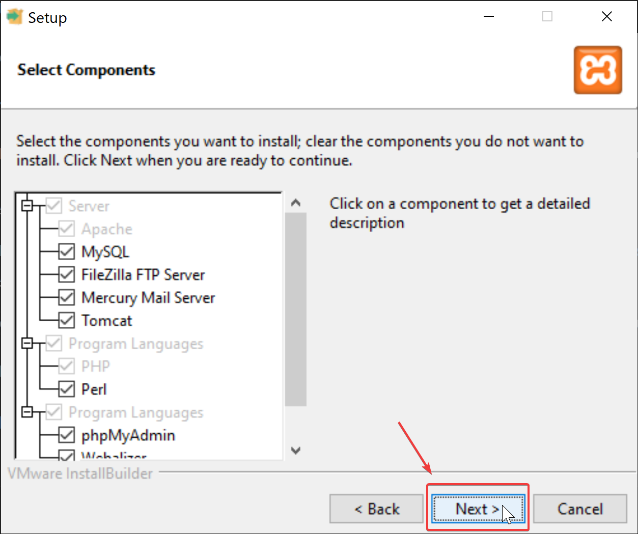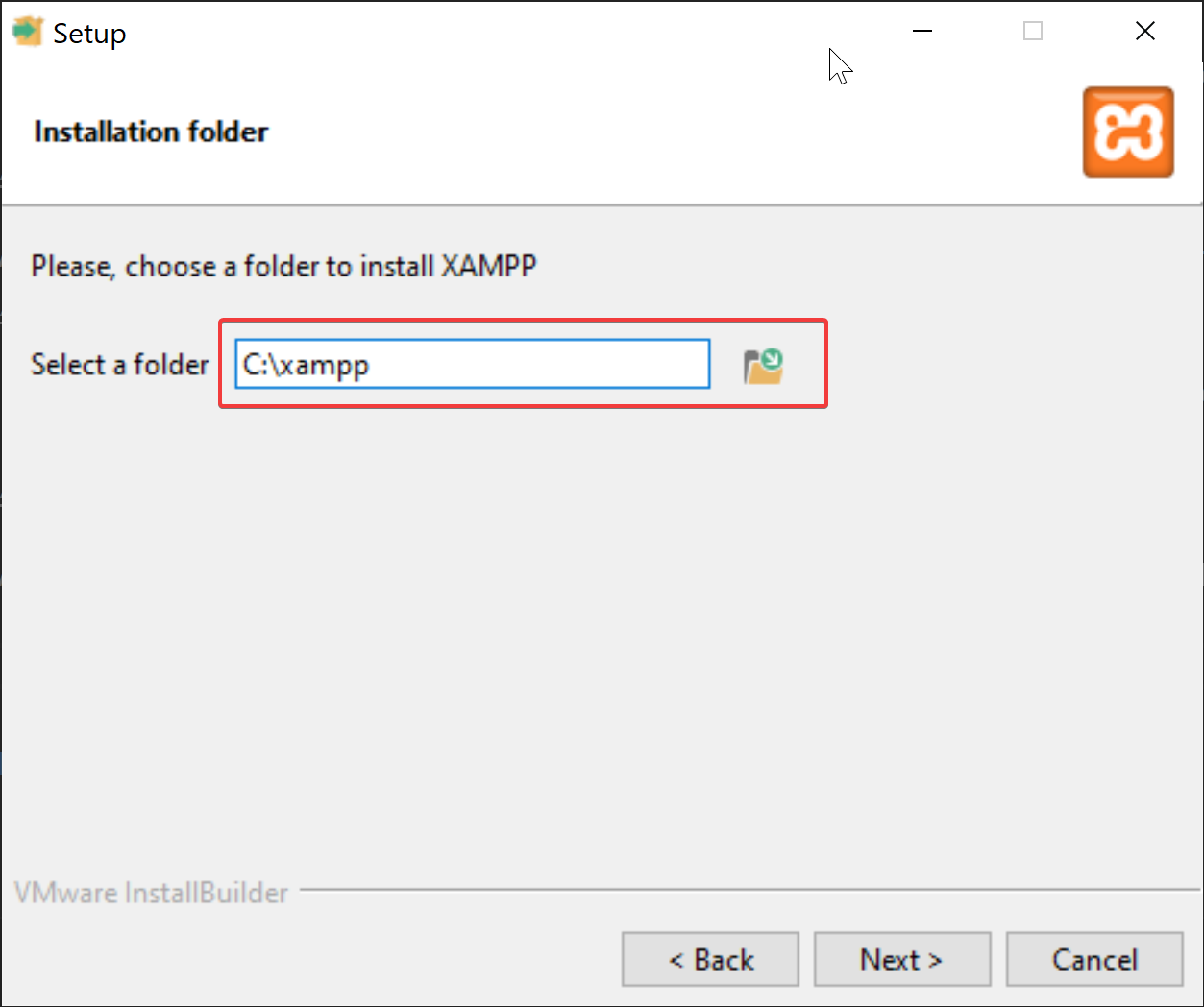 C:\xampp, which should also be the default. Then, click "Next".