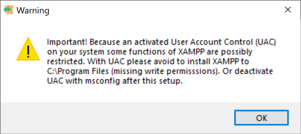 - Run the XAMPP .exe file. If you see this warning, as long as you follow this guide, you can ignore it and just hit "OK".