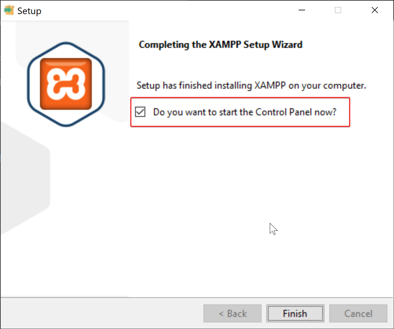 - Once XAMPP has installed, check the box to start the control panel immediately (if it is not checked by default) and click "Finish".