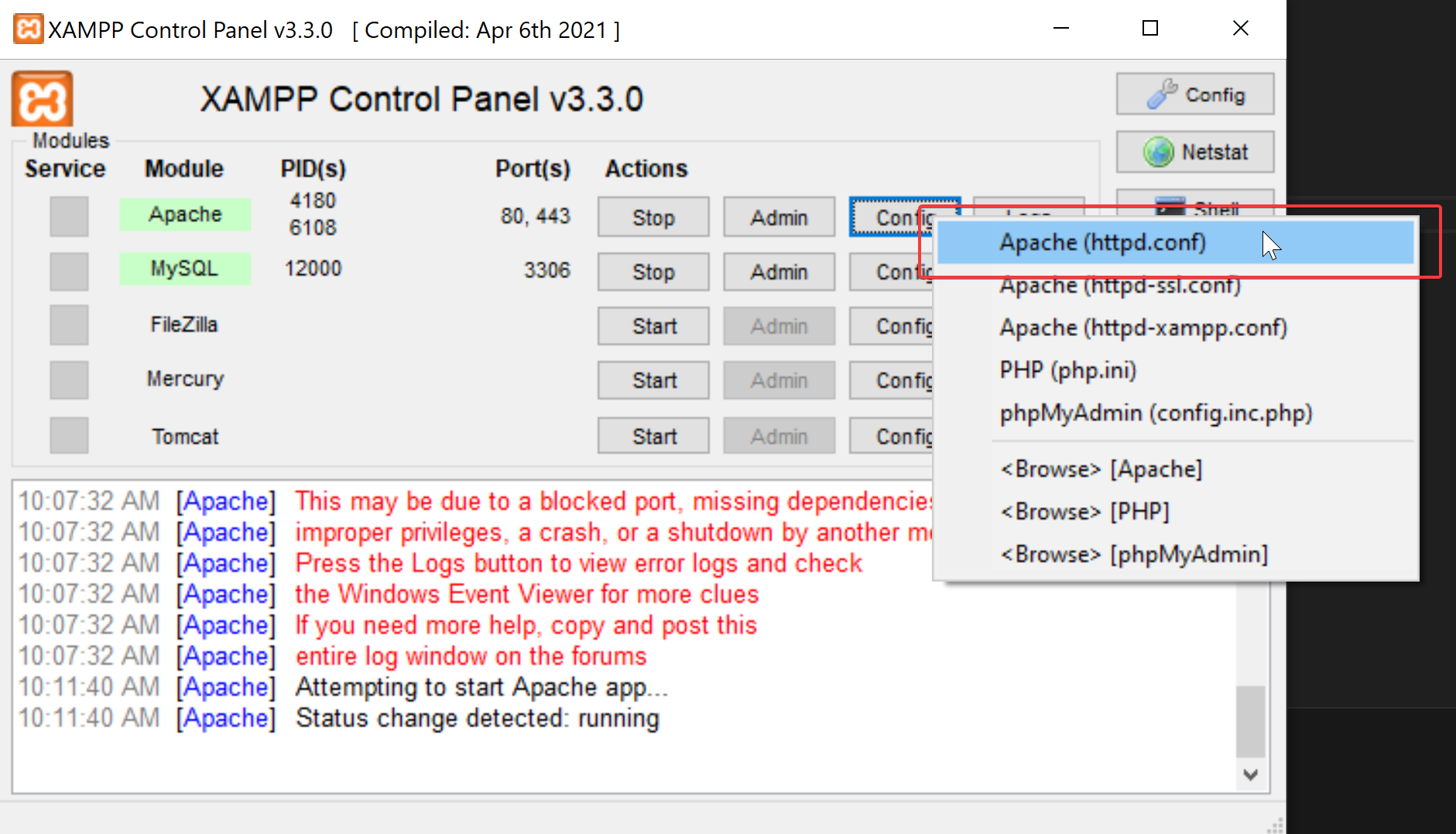 - Next, we need to update the config files. Click "Config" next to Apache, and select