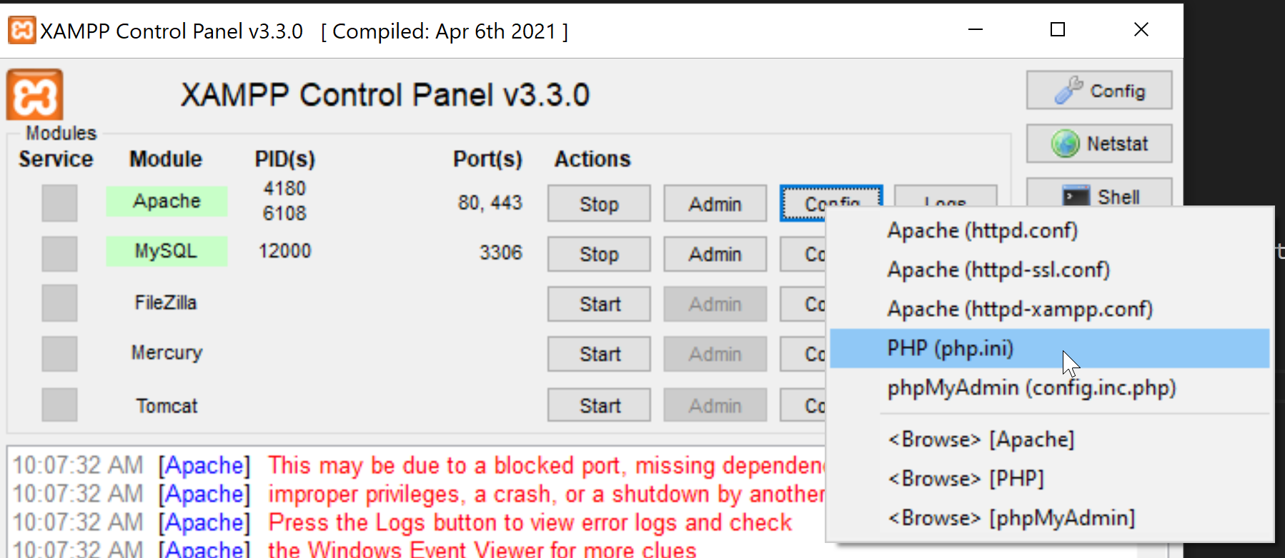 Go back to XAMPP, click "Config", and select