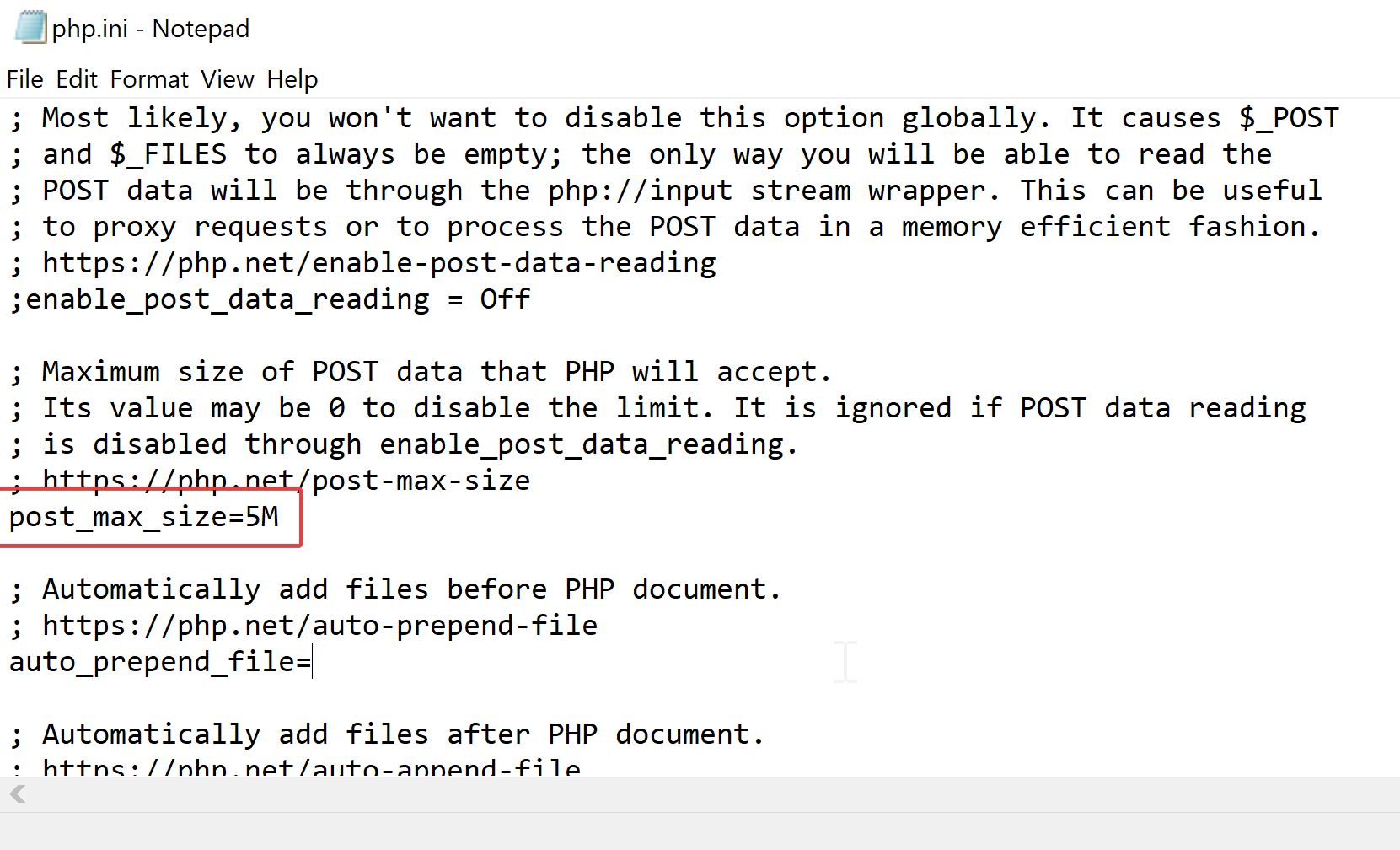 post_max_size. This controls how large the files are that you can upload. Change this to a number similar to what you'll use on your live website. If you don't know yet, change it to5M(five megabytes).