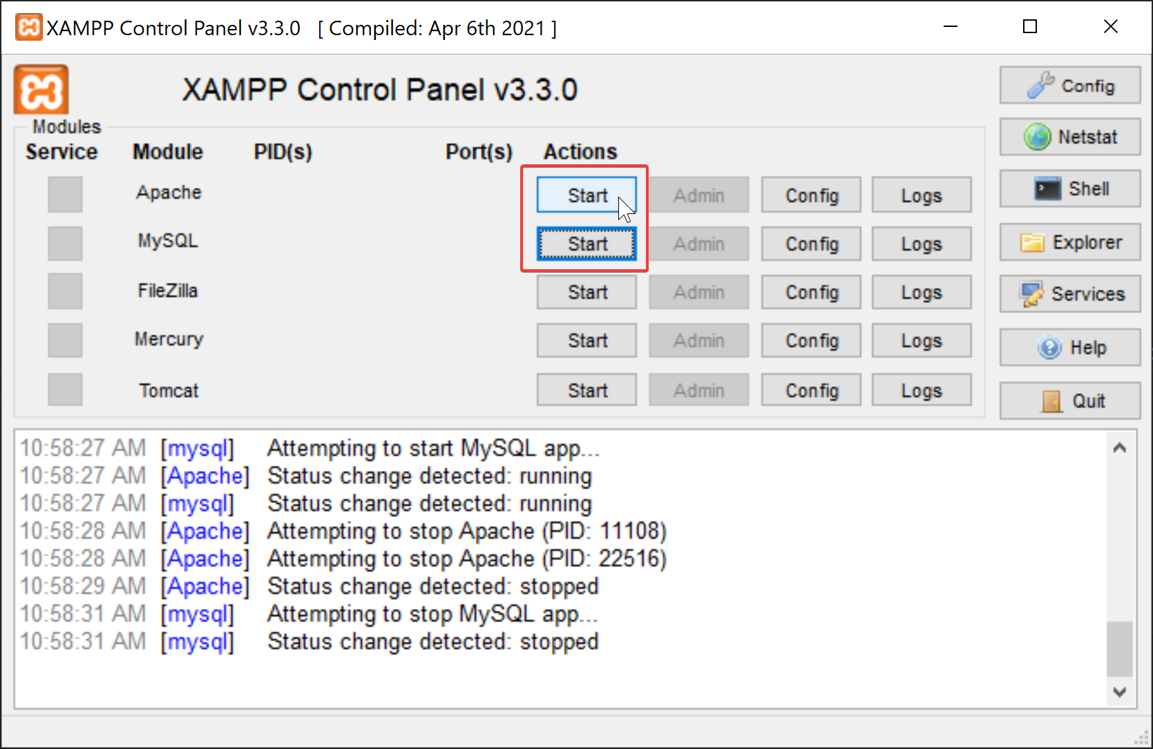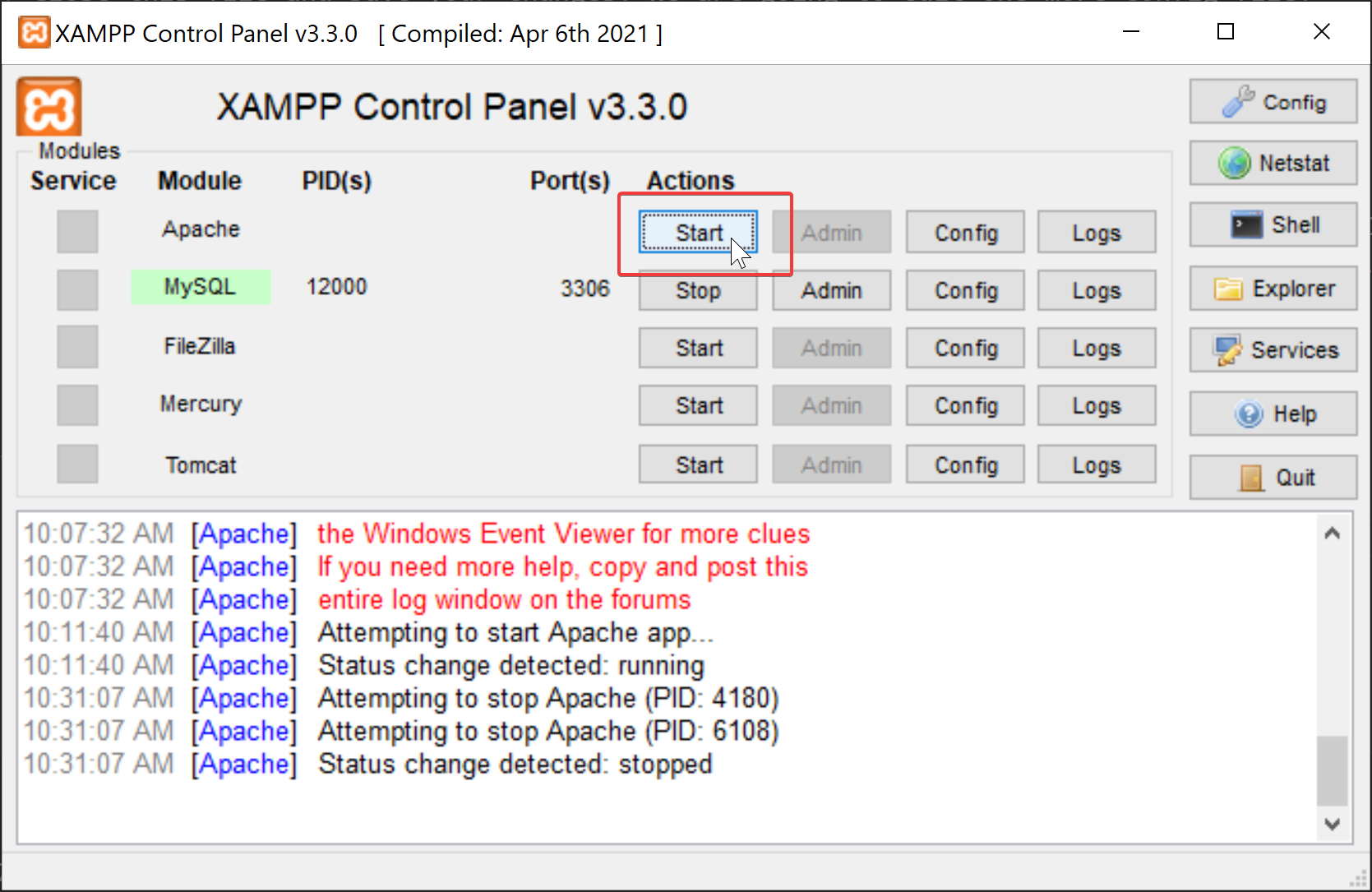 - Save your changes and close this file. Then, click the "Stop" button next to Apache. After it fully shuts downs, click "Start" again.