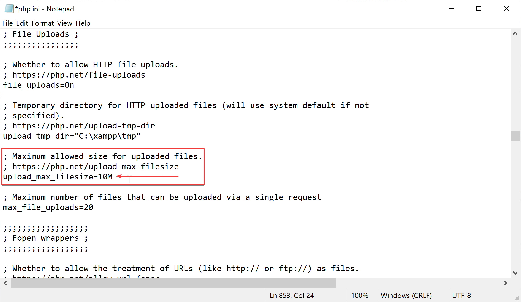 upload_max_filesize. I like to change this to abnormally high on my local, but make it whatever feels right for you. To change it to 10 megabytes, for example, put a value of10M.