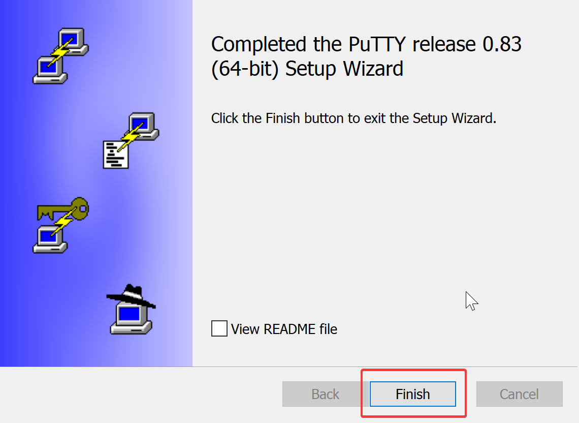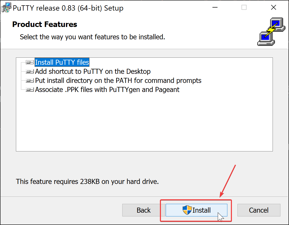 - We're going to click through the screens to install PuTTY. Click "Next", leaving all settings as default, until you reach the "Install" button.