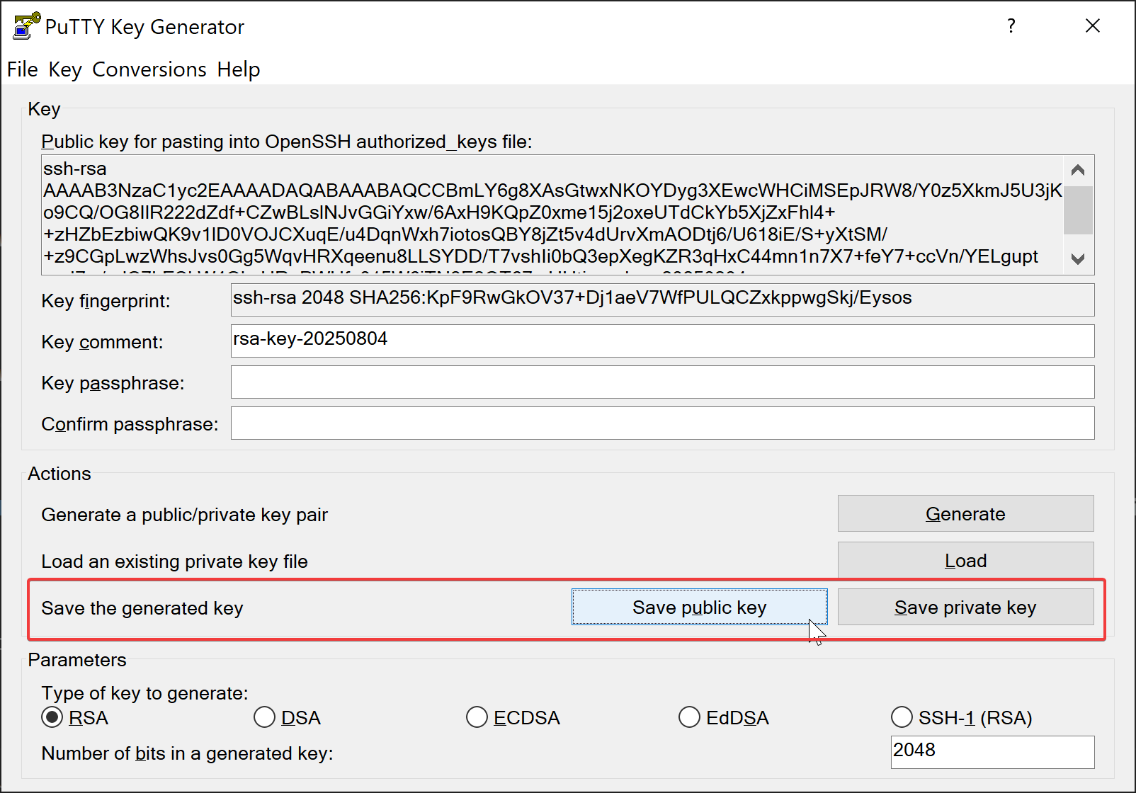 - Save both your Public and Private key to somewhere safe on your computer. The key is shown in this image for example's sake, but do not share your key publicly! It's better to have people set up their own keys than to share yours.