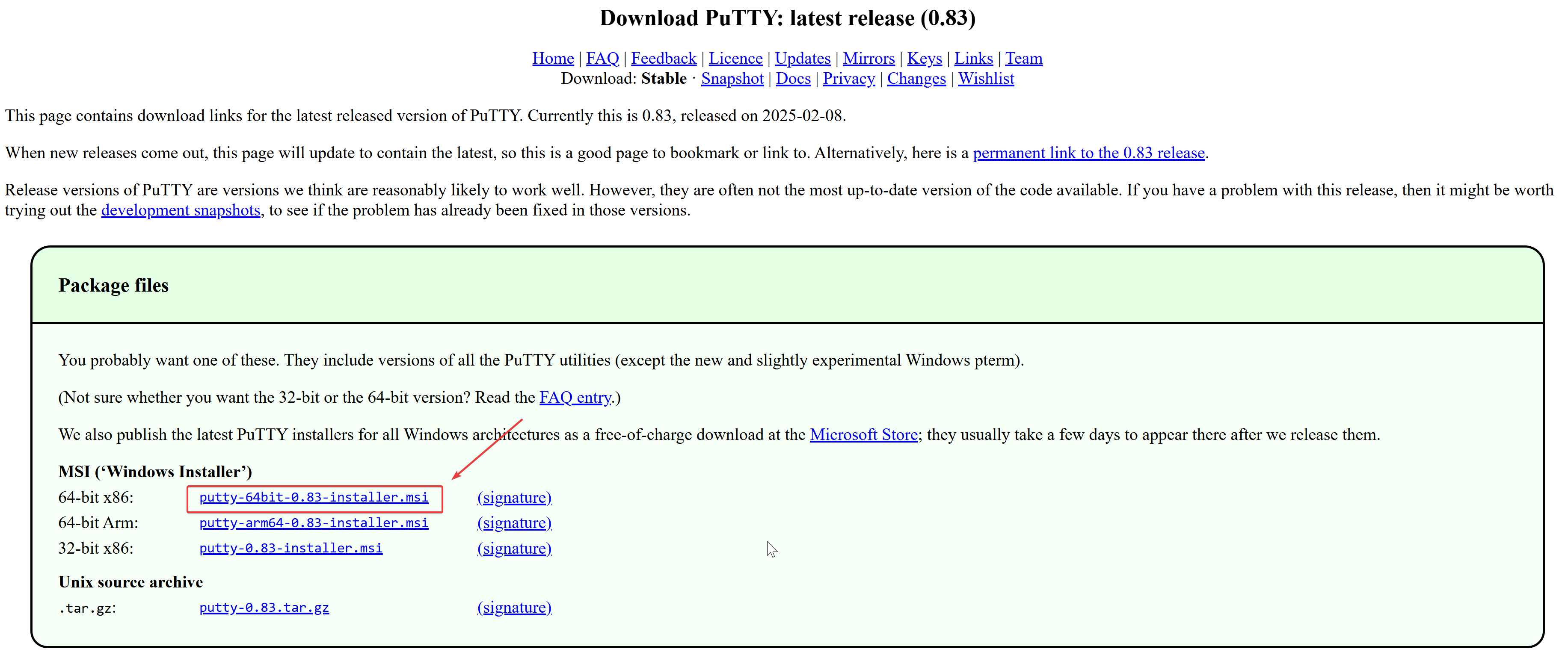 - Go here to download PuTTY. Click the highlighted link to download it -- for most cases, you want the "64-bit x86" version.